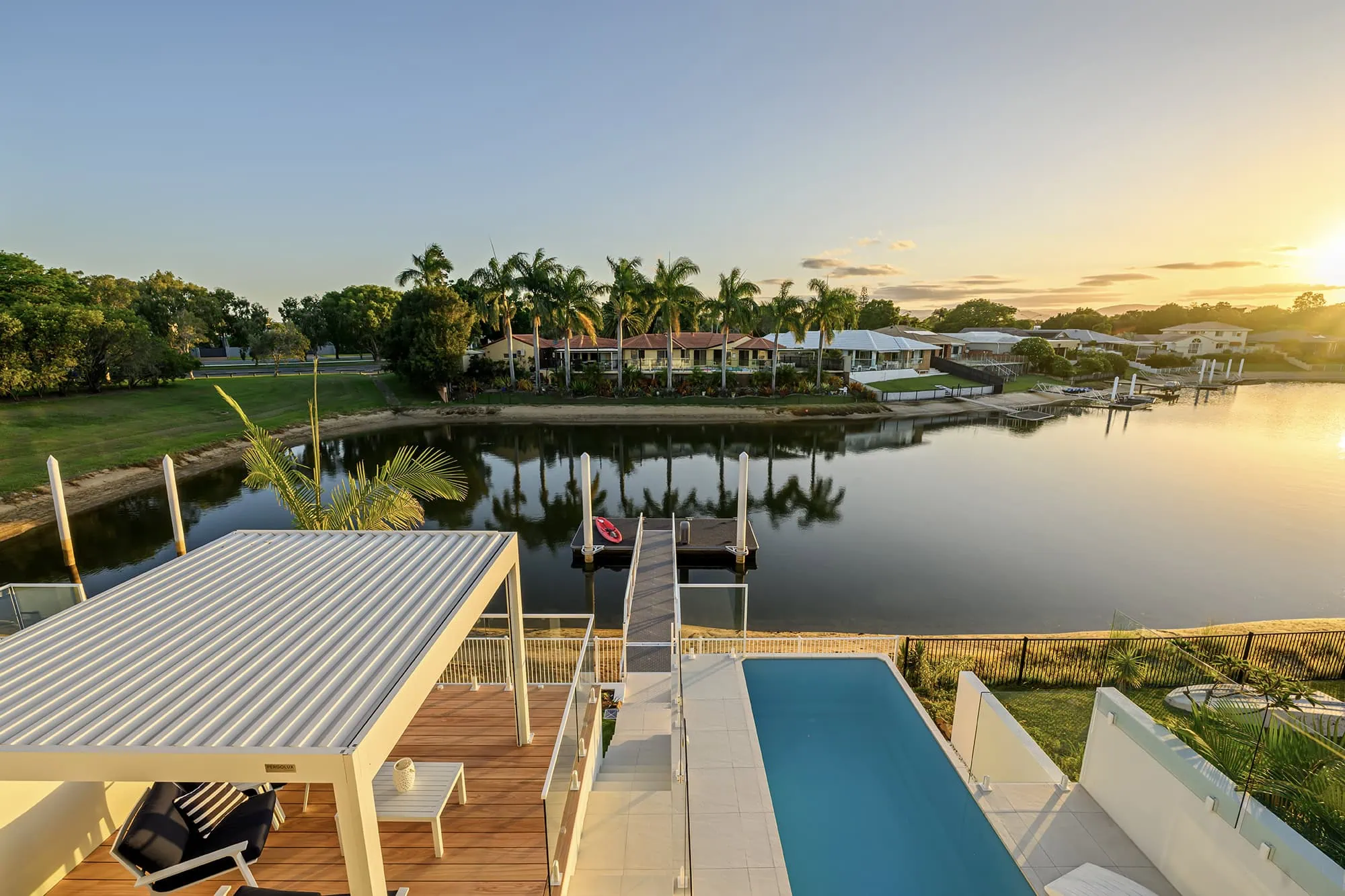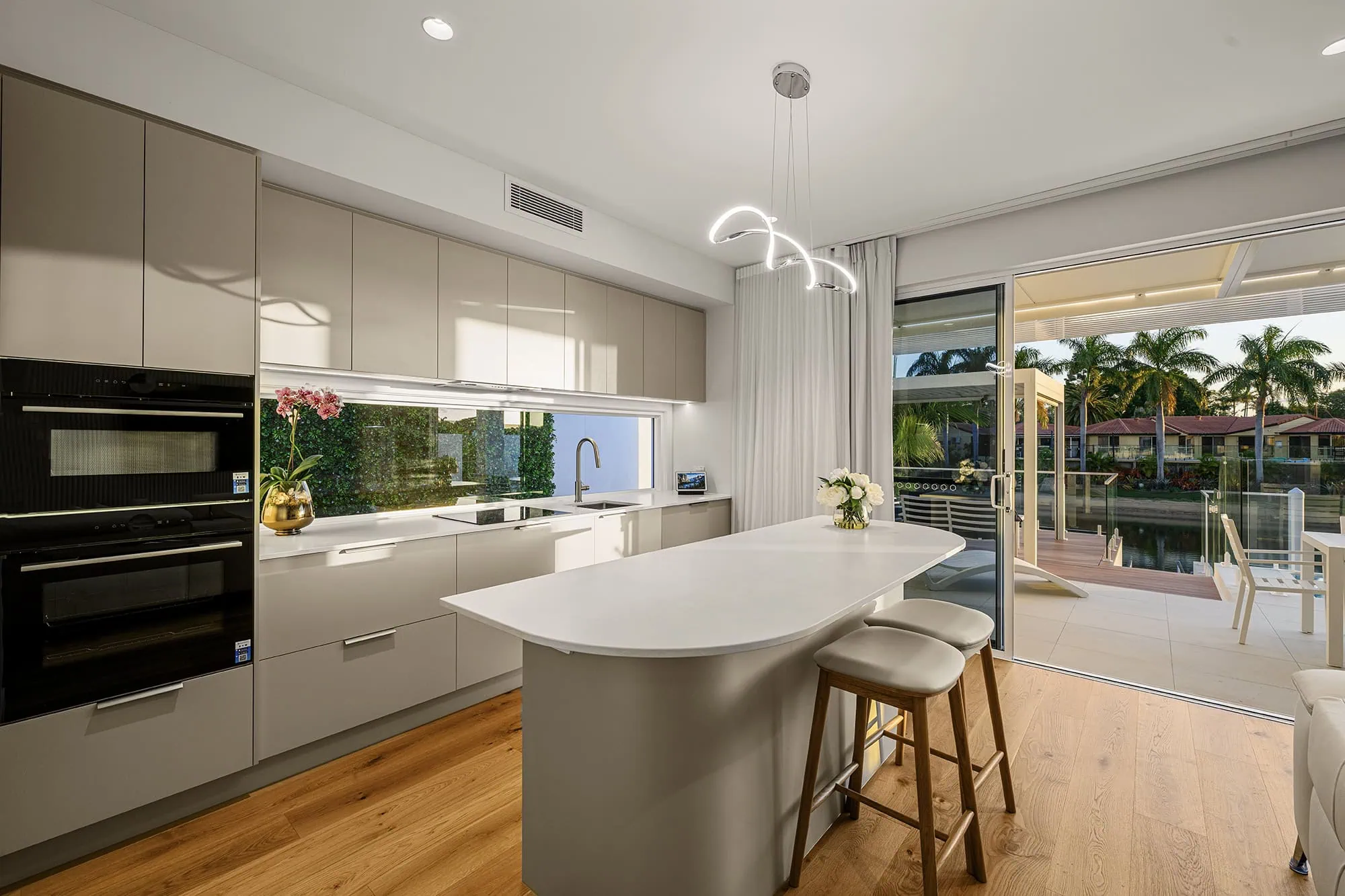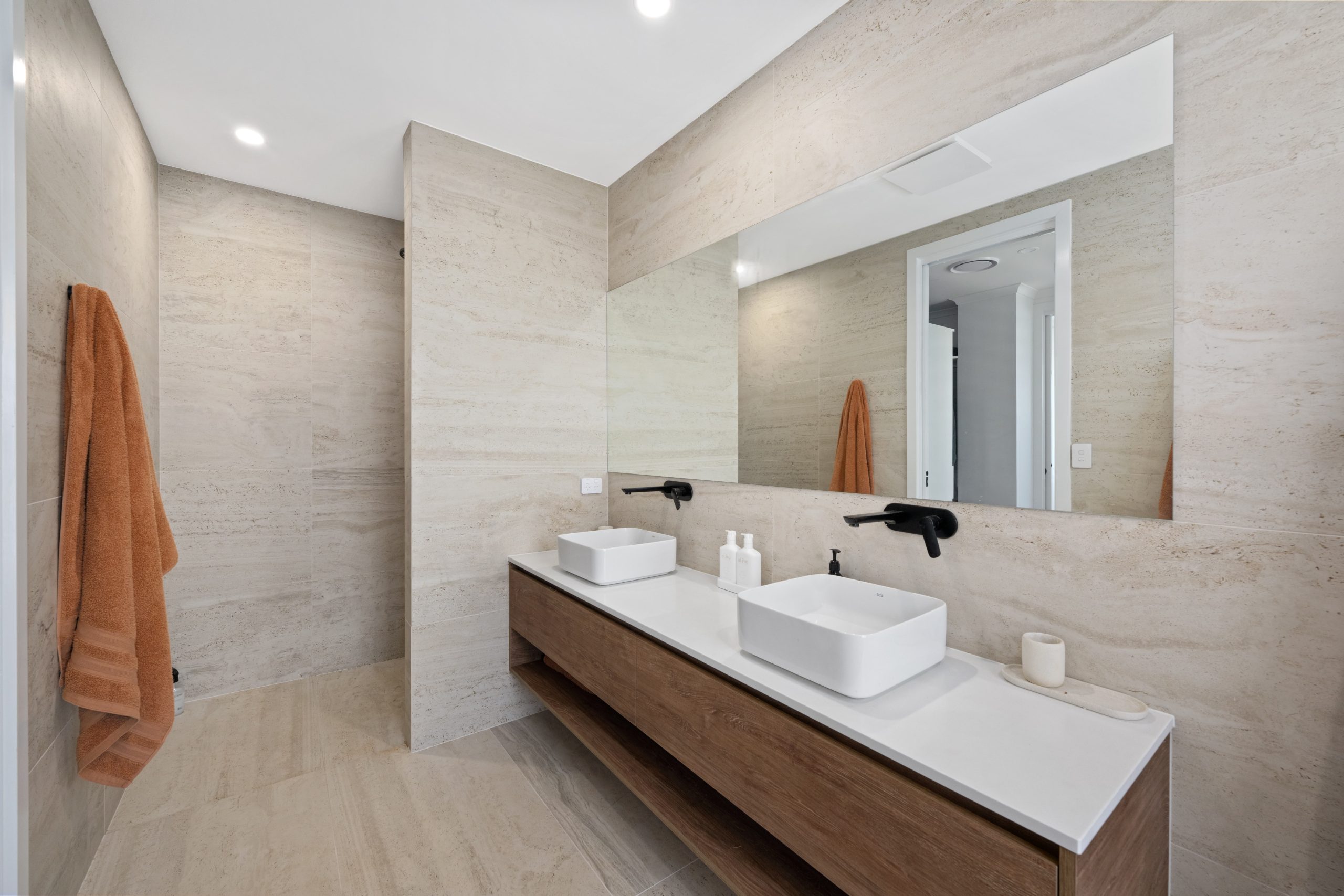 Waterfront luxury at Calypso Bay, QLD. Prepare to be captivated by the seamless fusion of modern aesthetics and timeless grace, as you pass through the custom oak entry doors, ambient feature lighting envelops you. Featuring 4 bedrooms & 4.5 bathrooms, including a private guest suite, enjoy panoramic views from the spacious layout designed to embrace the essence of waterfront living.